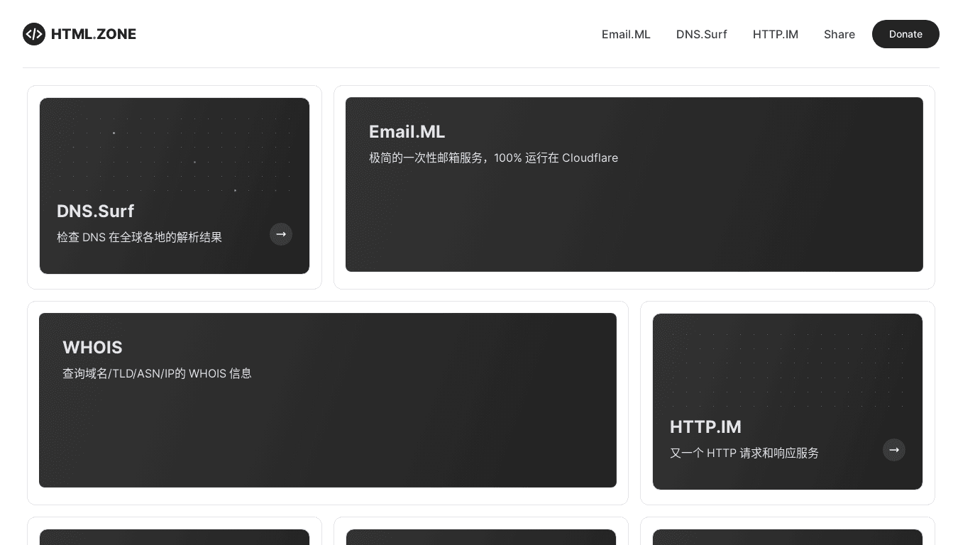 Email.ML Minimalist temporary Email. DNS.Surf Querying DNS Resolution Results in Different Regions Worldwide. HTML.ZONE Web Toolbox.